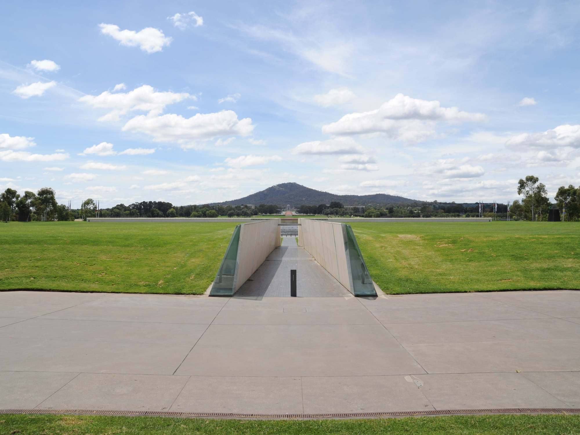From the Parliament House side, only a central cut in the lawn can be seen, with the lake visible beyond, and the entire design on axis with Anzac Parade and Mt Ainslie in the distance.