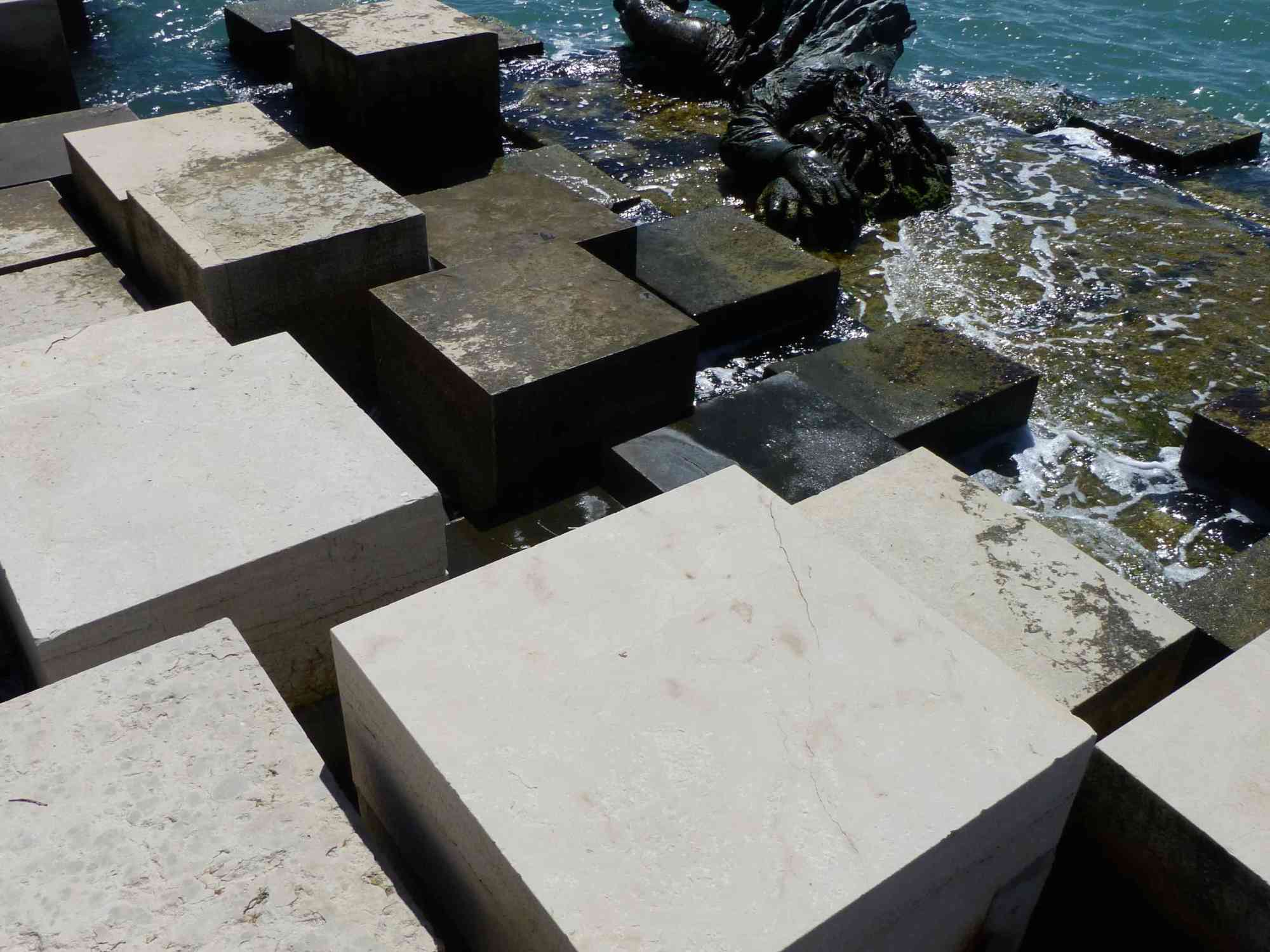 Carlo Scarpa was engaged to locate the sculpture and suggested placing it in the water near the Giardini where he felt it would be seen from above and would have greater impact. There he attached it to a floating caisson that could rise and fall with the tide. Scarpa then designed a composition of square stepping stones, constructed of concrete blocks topped with Istrian stone, that would lead people down to the sculpture. With this project Scarpa again engaged with the idea of the rising waters of Venice that he had explored at the Querini-Stampalia Library a few years before.
